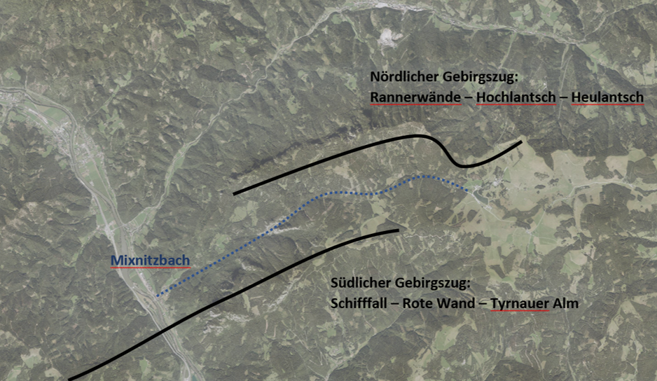 Der südliche Gebirgszug beginnt westlich der Mur mit dem „Schifftal“ bei Traföss und setzt sich östlich der Mur im „Röthelstein“ und der „Roten Wand“ bis über die „Tyrnau“ fort. Zwischen beiden Zügen liegen Teile der Teichalm und die „Bärenschützklamm“.