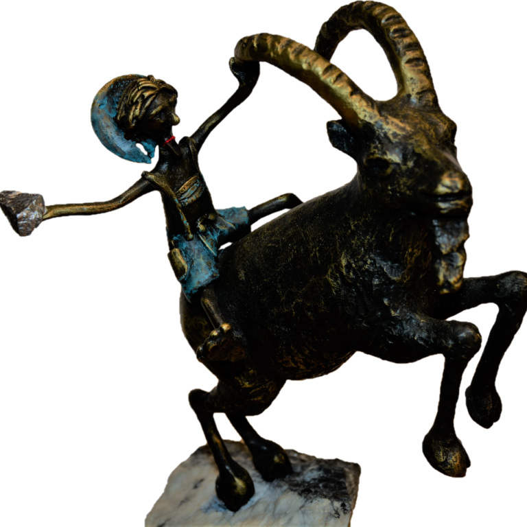 Die karikative dynamische Bronzestatue auf Magnesitstein zeigt einen sich aufbäumenden Steinbock mit Reiter in Lederhose und mittelalterlichem Bergbauhut.